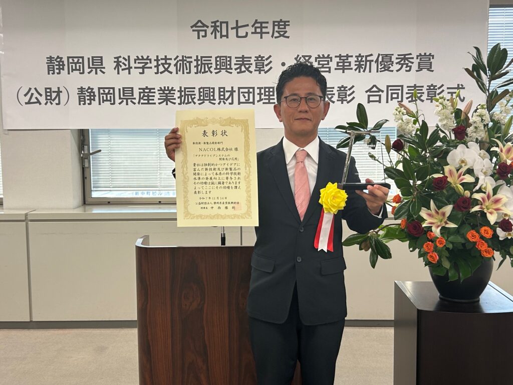 当社のNADS製品が、2025年度公益財団法人 静岡県産業振興財団「新技術・新製品開発部門」理事長賞を受賞し、代表取締役社長の杉村が表彰されました。